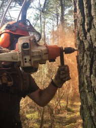 Après avoir choisi précisément les parcelles et les tiges à exploiter cette année, c'est parti, on perce les arbres !